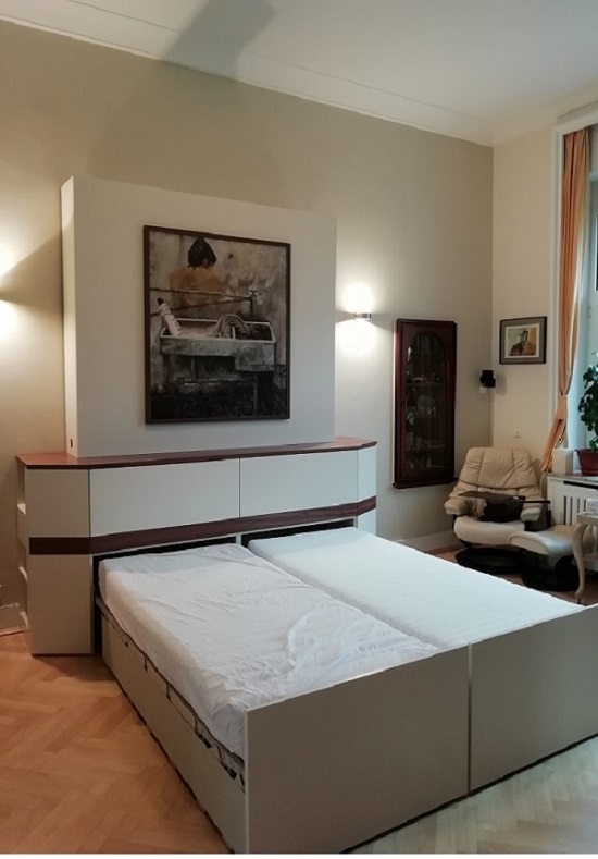 elektrisches Schrankbett Fa. Hartmann Belitec in ein Wohnzimmermöbel integriert. Korpus mit abgeschrägten Nachttischen und integrierter Nachttischlampe. Das Bettzeug wird in einer Klappschublade oberhalb des Bettauszuges verstaut. Oberfläche des Möbels in Lack weiß mit Kirschbaum kombiniert.